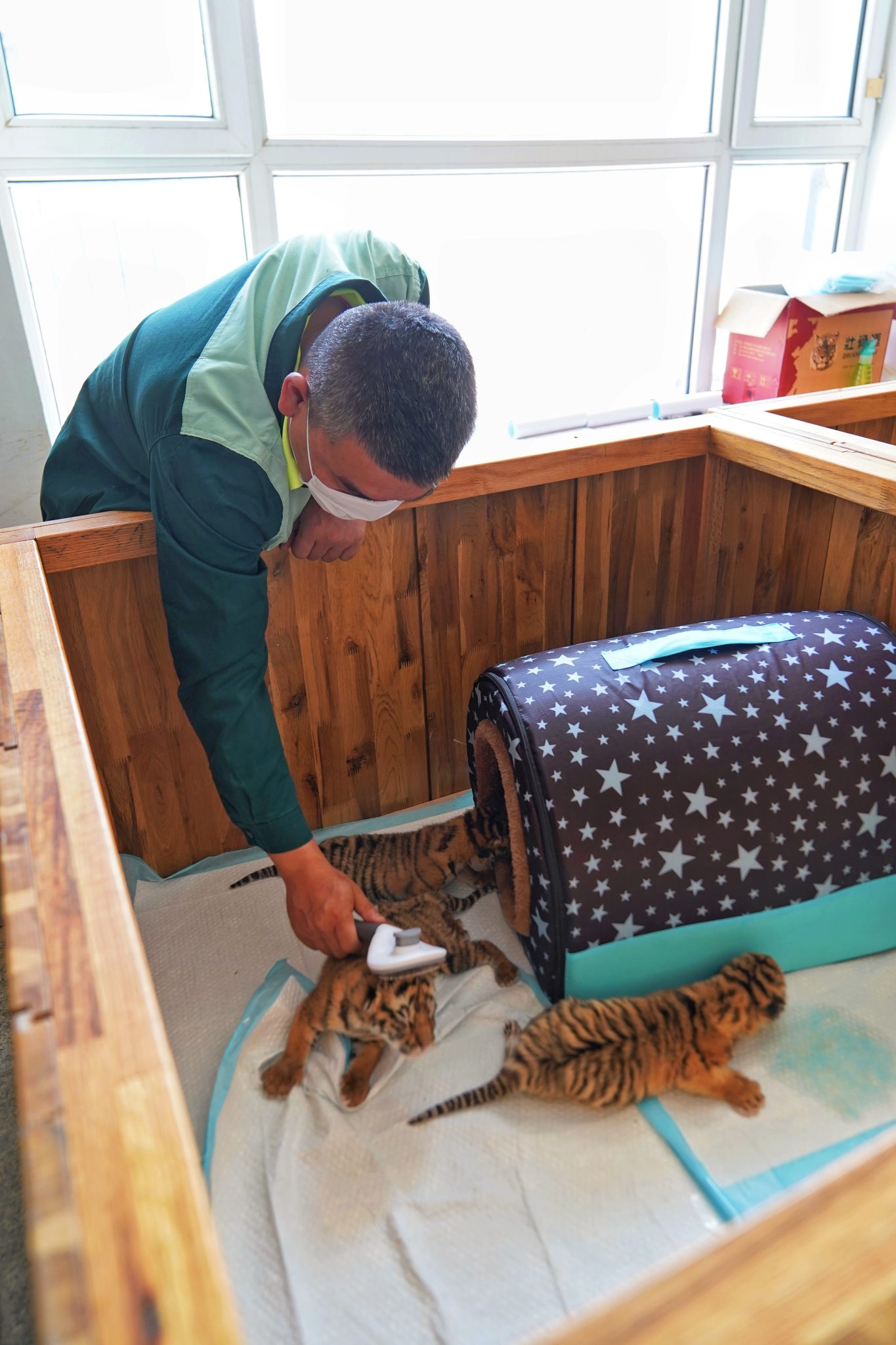 近日,14只東北虎幼崽降生黑龍江東北虎林園。據(jù)飼養(yǎng)員介紹,目前幼虎們身體狀況均良好,待產(chǎn)室內(nèi)還有多只母虎即將在本月生產(chǎn)。視覺中國(guó)