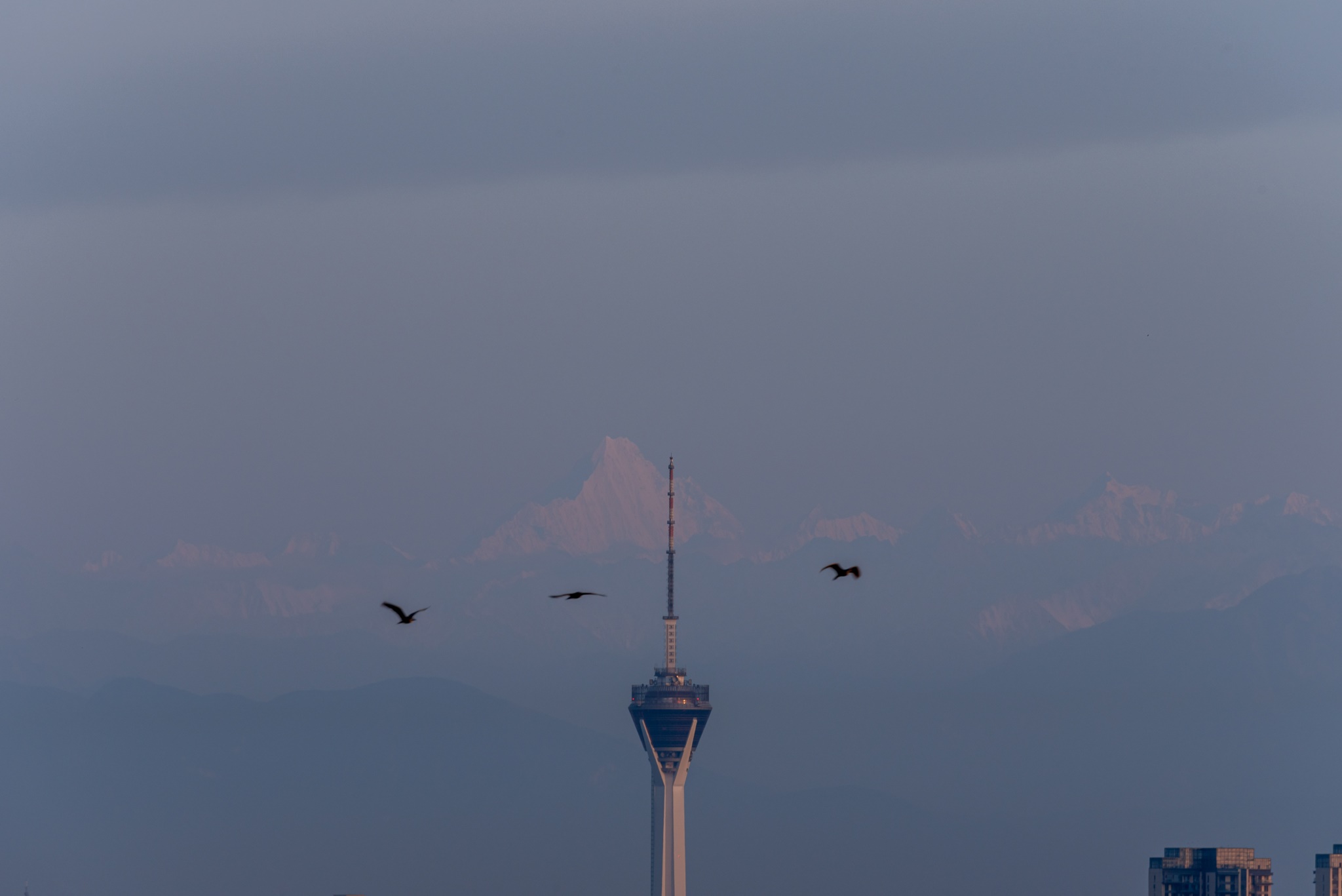 2023年5月13日,成都,幺妹峰露出真容,與城市建筑同框。視覺中國(guó)