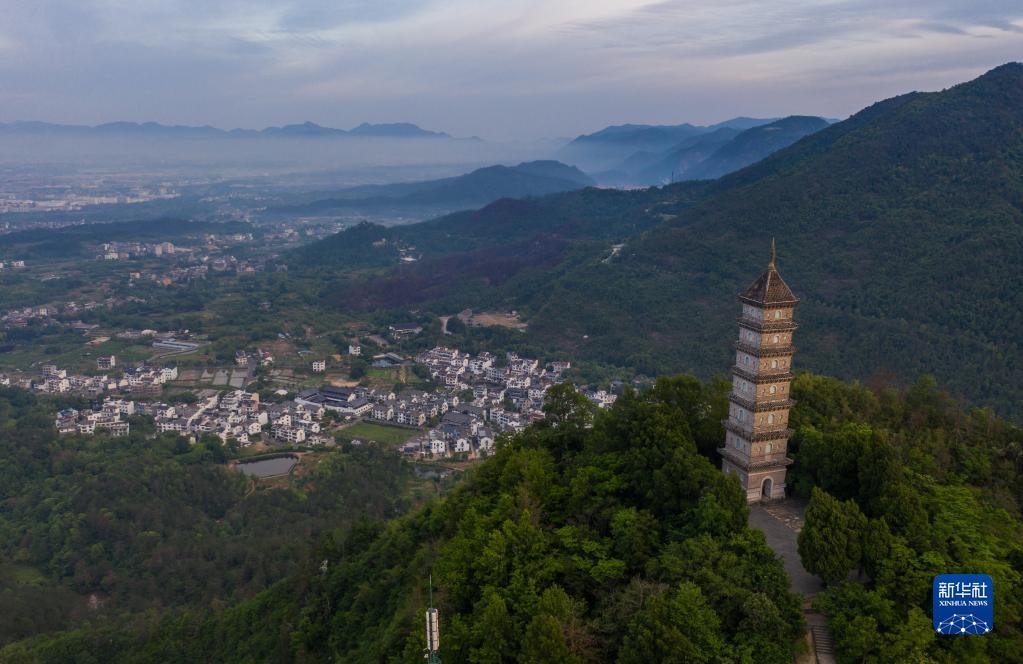 5月16日,在浙江天臺(tái)縣,清晨的陽光照在赤城山頂?shù)牧哄希o人機(jī)照片)。