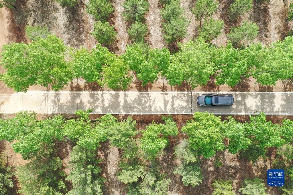 車(chē)輛在山西省右玉縣新城鎮(zhèn)道路上行駛(5月19日攝,無(wú)人機(jī)照片)。