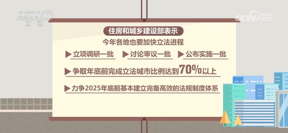 住房城鄉(xiāng)建設(shè)部表示,2023年,各地也要加快立法進(jìn)程,立項調(diào)研一批、討論審議一批、公布實施一批,爭取年底前完成立法城市比例達(dá)到70%以上,力爭2025年底前基本建立完備高效的法規(guī)制度體系。
