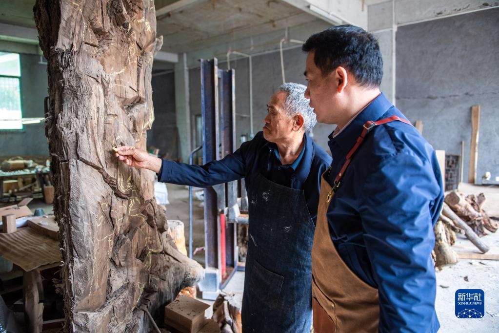 5月23日,在洞口縣巖山鎮(zhèn)陽家山村,洞口木雕非遺傳承人傅立先(左)和父親傅金林在創(chuàng)作木雕作品。