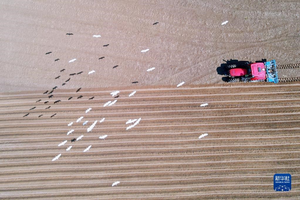 初夏時節(jié),江蘇省如皋市磨頭鎮(zhèn)天陽社區(qū)農(nóng)田里,農(nóng)機在田野間往來穿梭,成群的白鷺在翻耕的土地上覓食、嬉戲,構成一幅美麗的生態(tài)畫卷。