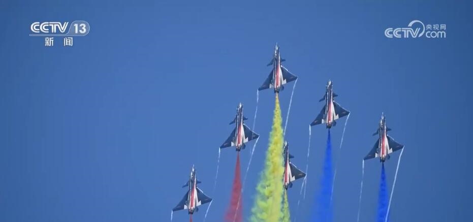 隨著滑出指令下達,噴著五星紅旗涂裝的6架表演機緩緩駛向起飛線。6架表演機在云底高度1000米氣象條件下依次起飛,在空中迅速集結(jié)組成箭形編隊。以人字形編隊低空通場,在空中以六道絢麗彩煙,以特殊禮儀向現(xiàn)場致以最崇高的敬意。