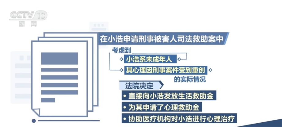 在此次發(fā)布的保護未成年人權益司法救助典型案例中,還涉及針對向未成年人提供專門心理救助金、提供心理危機干預等立體幫扶,進一步延伸司法服務。在小浩申請刑事被害人司法救助案中,小浩的父親被害,其本人亦受到人身傷害,法院作出刑事附帶民事判決,判處被告人死刑,并判決其賠償附帶民事訴訟原告人經(jīng)濟損失13萬余元。后經(jīng)調(diào)查,被告人無財產(chǎn)可供執(zhí)行。考慮到小浩系未成年人,其心理因刑事案件受到重創(chuàng)的實際情況,法院除決定直接向小浩發(fā)放生活救助金外,還為其申請了心理救助金,協(xié)助醫(yī)療機構(gòu)對小浩進行心理治療。