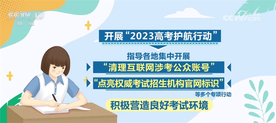 此外,將繼續(xù)開展“2023高考護航行動”,指導各地集中開展“清理互聯(lián)網涉考公眾賬號”“點亮權威考試招生機構官網標識”等多個專項行動,積極營造良好考試環(huán)境。
