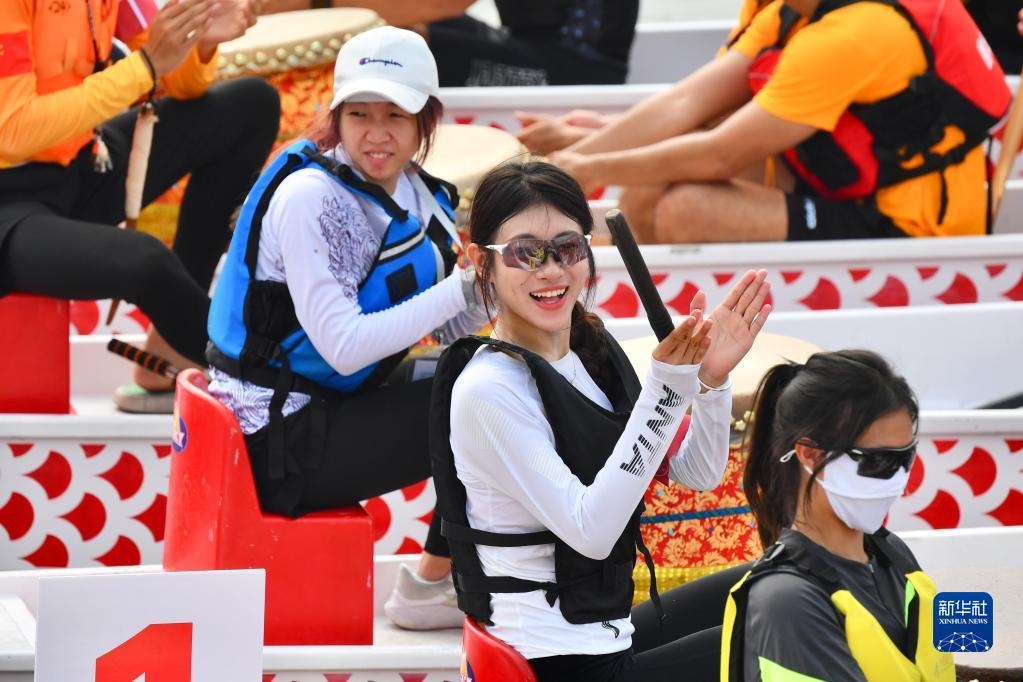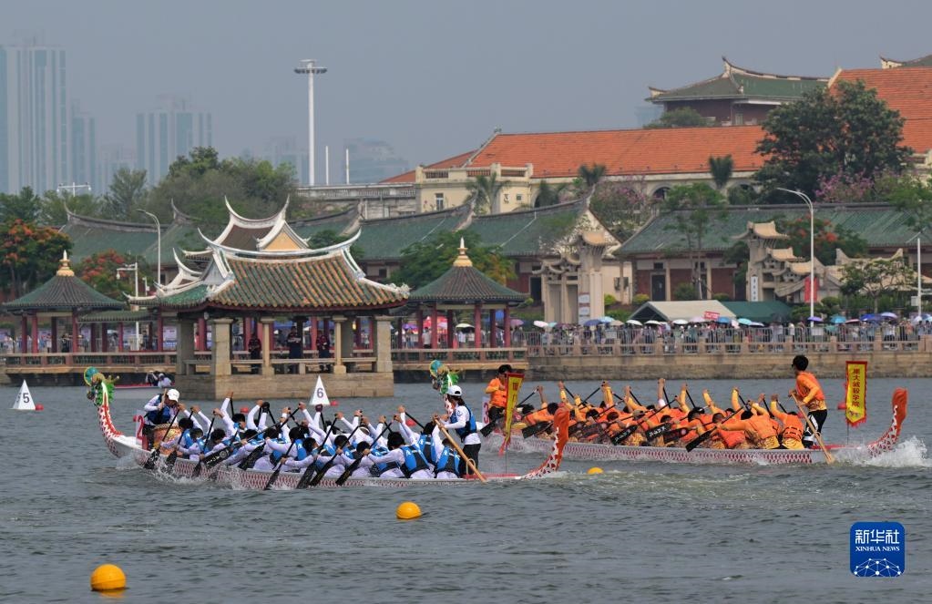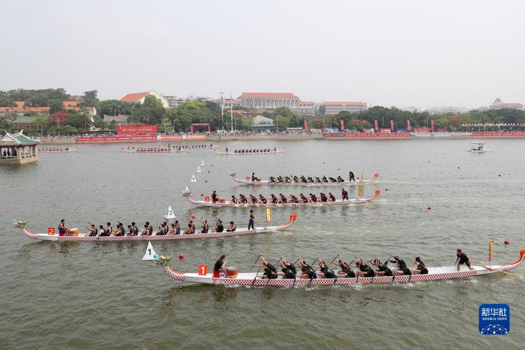 6月3日,在福建廈門集美龍舟池,來自海峽兩岸的龍舟隊競渡爭先。
