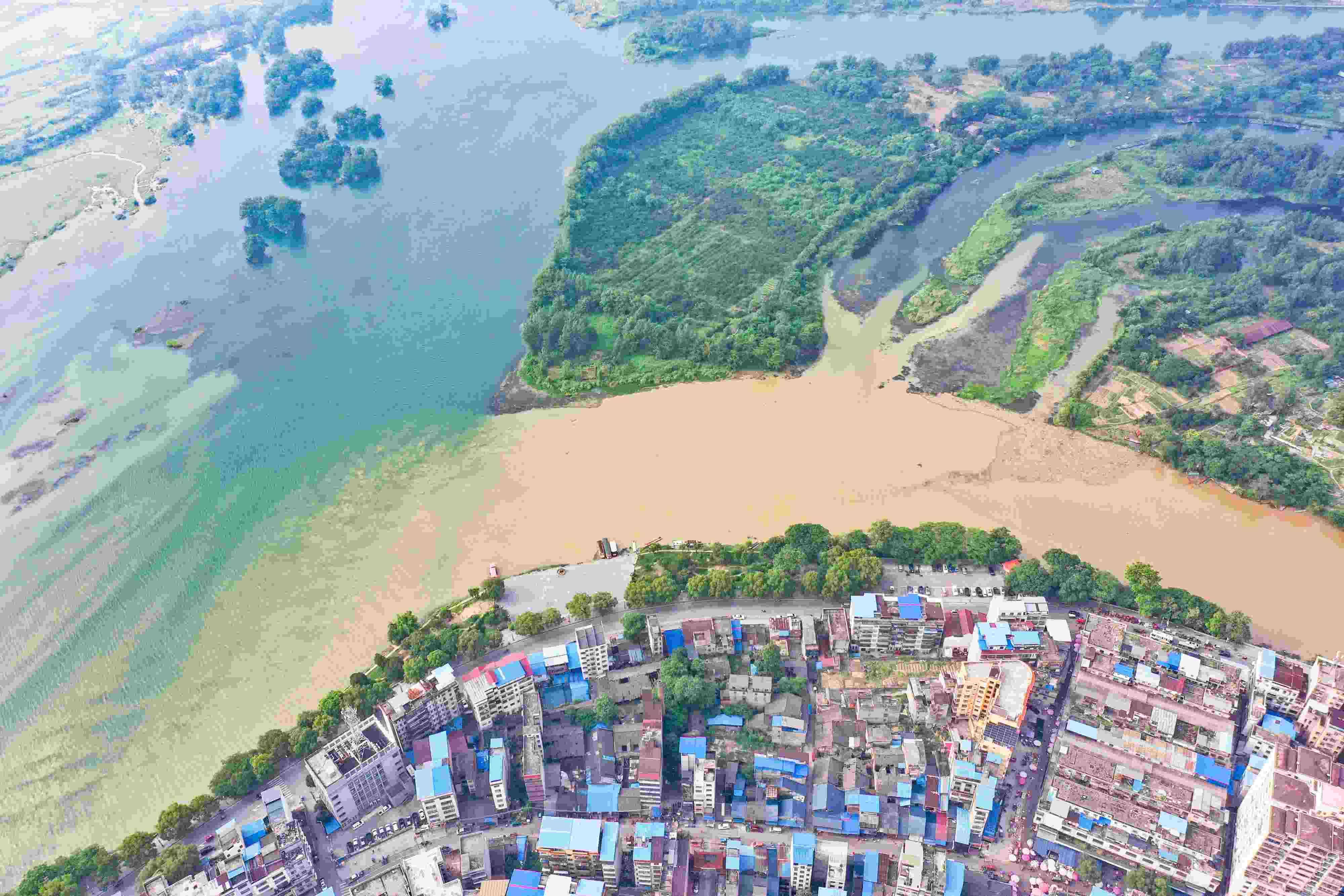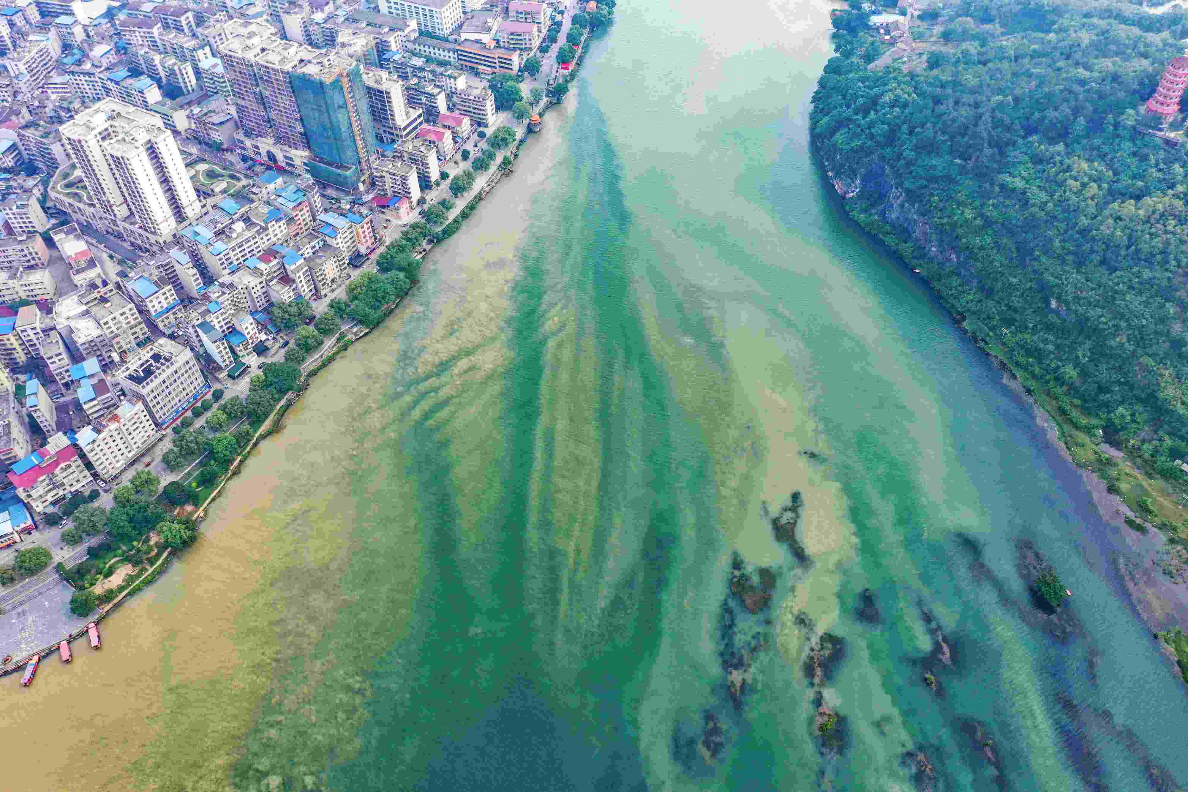 2023年6月4日,受降雨影響,廣西桂林全州縣城湘江河段出現涇渭分明景觀??罩懈╊娼Я魅f鄉(xiāng)河混濁的河水繞城匯入清澈的湘江干流,交匯之處涇渭分明。 視覺中國