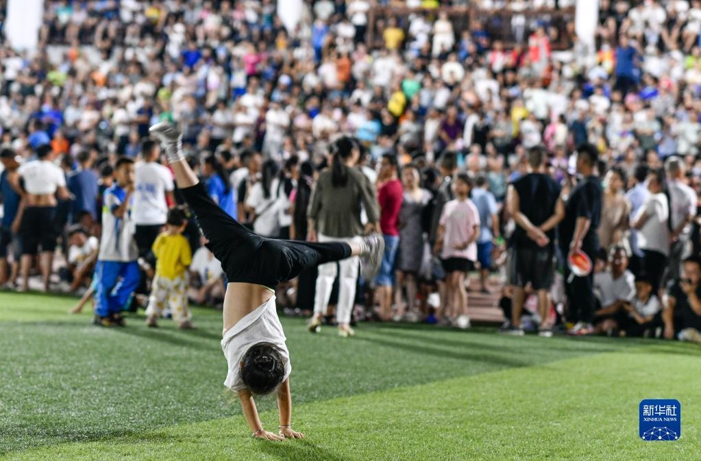 6月9日,小朋友在貴州“村超”足球比賽半場(chǎng)休息時(shí)間展示體操。