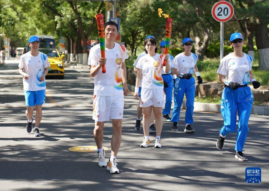 6月10日,火炬手邢衍安(左二)在火炬?zhèn)鬟f中。
