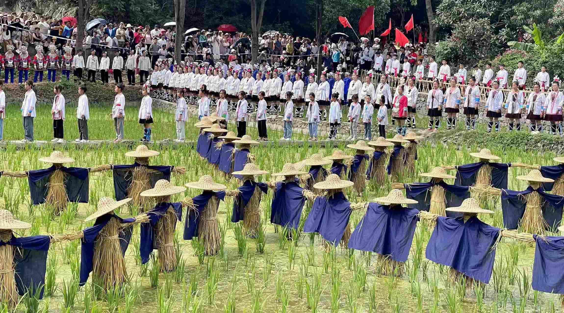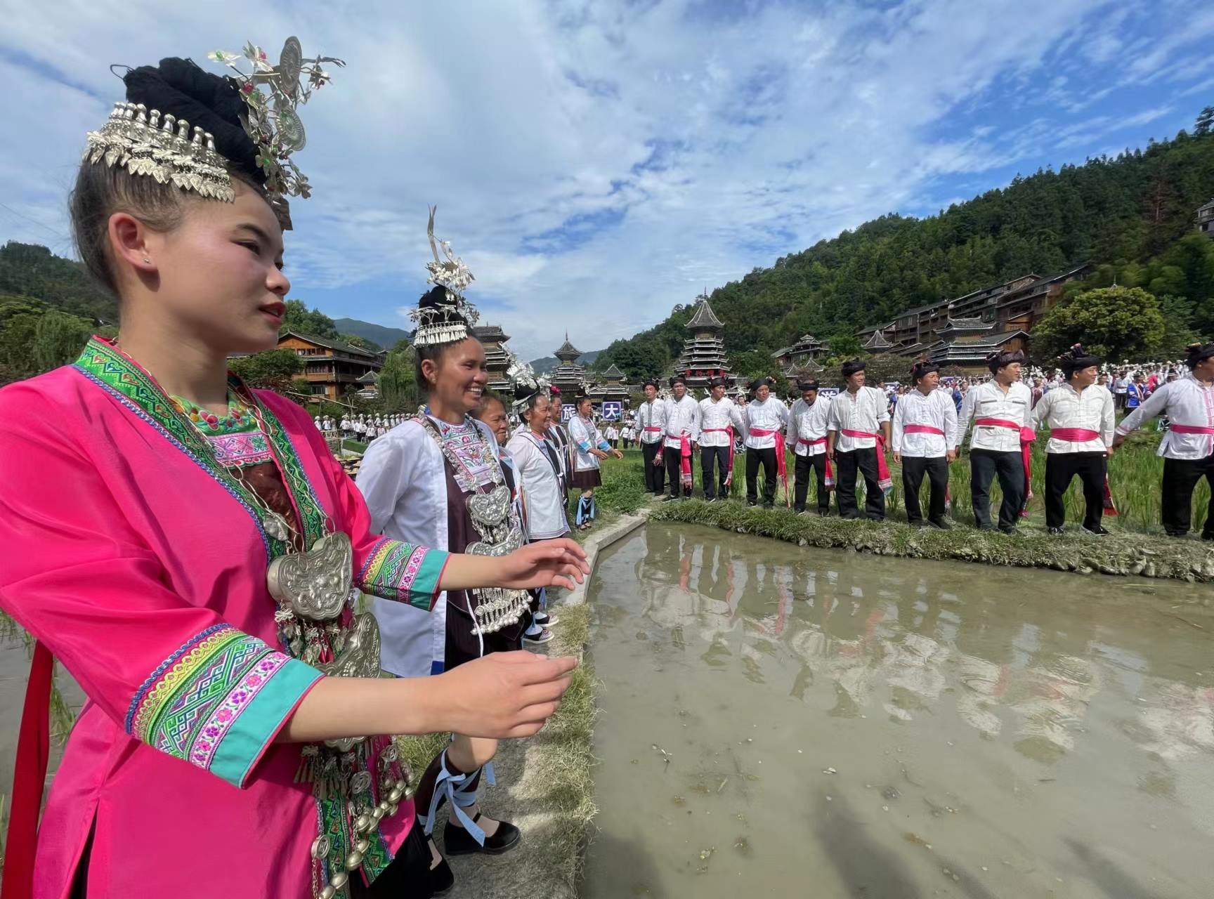 2023年6月10日,侗族同胞在貴州省黎平縣肇興侗寨田園實景展示侗族大歌。 (寧堅 鄧永生)