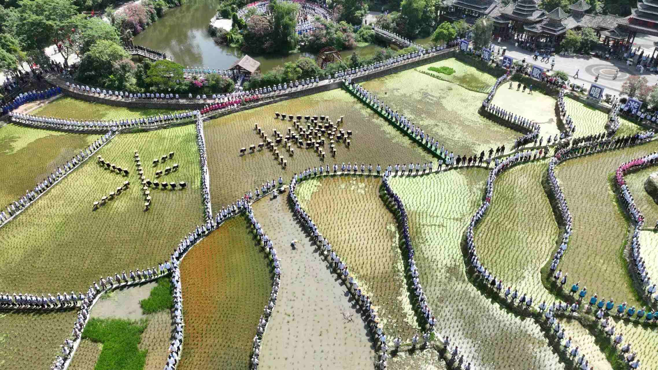 2023年6月10日,侗族同胞在貴州省黎平縣肇興侗寨田園實景展示侗族大歌。