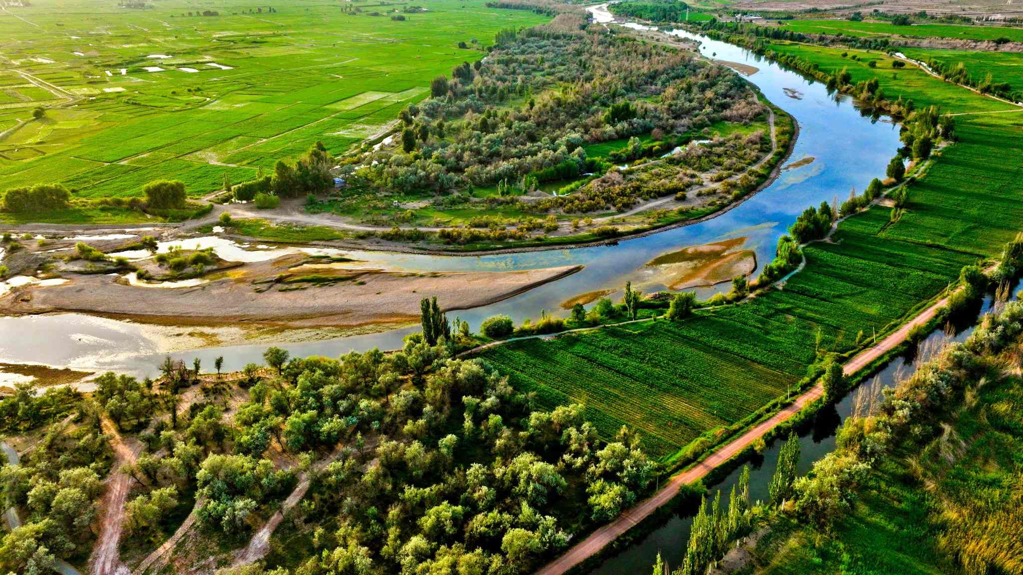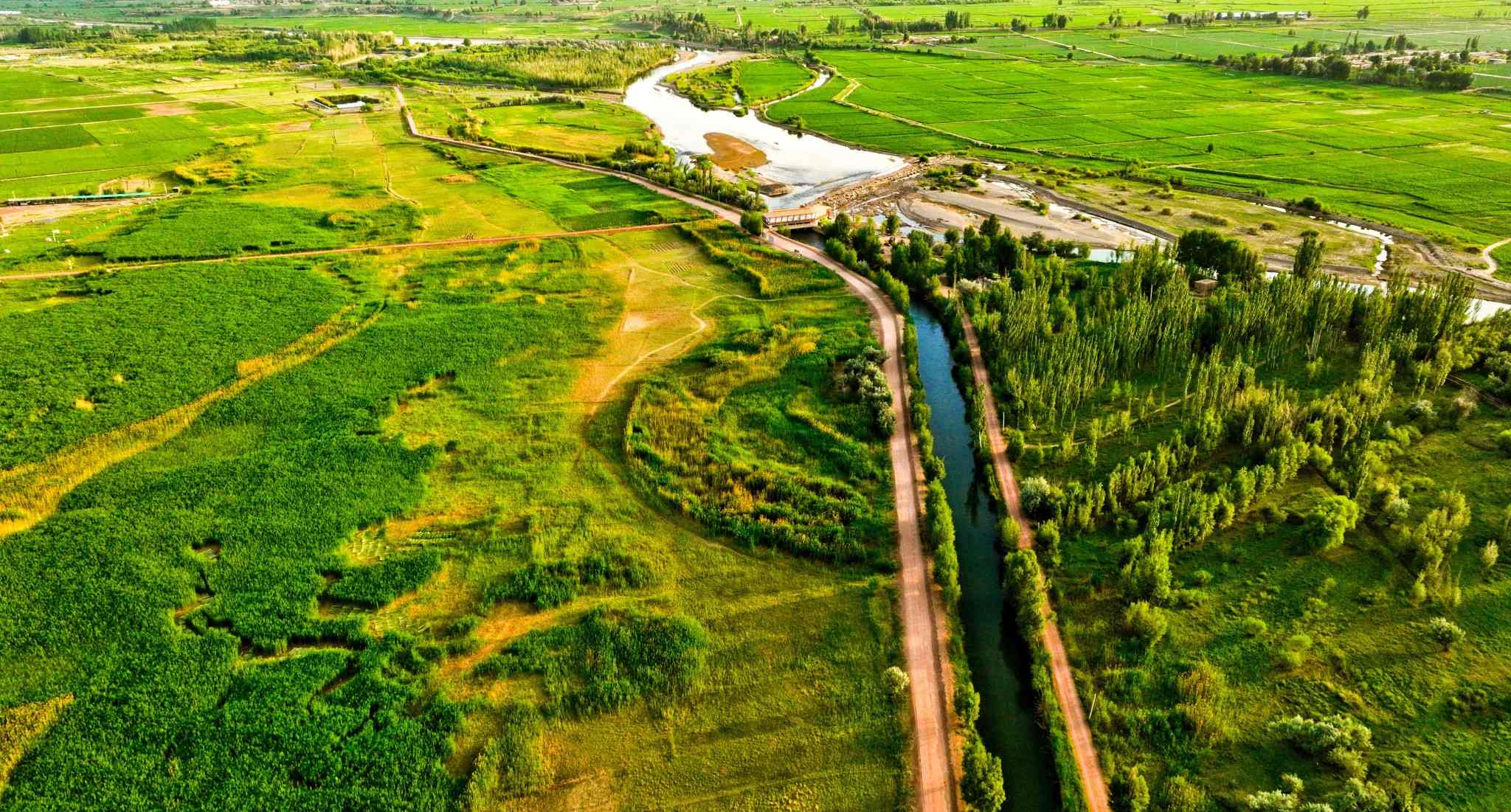2023年6月15日,甘肅省張掖市,甘州區(qū)靖安鄉(xiāng)、臨澤縣板橋鎮(zhèn)境內(nèi)的黑河兩岸,寬闊的河床、彎曲的河流、農(nóng)作物以及樹(shù)木、蘆葦、濕地在夕陽(yáng)的映照下綠意盎然。視覺(jué)中國(guó)