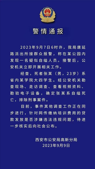 ·西安高新警方通報(bào)“大四學(xué)生自縊身亡”:排除刑案,正進(jìn)一步核實(shí)網(wǎng)傳貸款問題。
