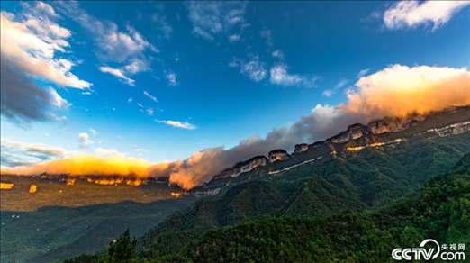 重慶市南川區(qū)金佛山北坡主峰,流云、流瀑、晚霞、落日交相輝映,壯美如畫。