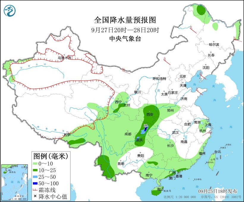 9月27日20時(shí)至28日20時(shí),黑龍江北部、甘肅西南部、陜西南部、四川東北部、重慶大部、云南西部、廣東沿海地區(qū)、海南島、西藏南部等地部分地區(qū)有中到大雨,其中,重慶西北部等地部分地區(qū)有暴雨(50~60毫米)。內(nèi)蒙古中部和北部、東北地區(qū)大部、山東半島等地部分地區(qū)有4~6級(jí)風(fēng)(見圖3)。