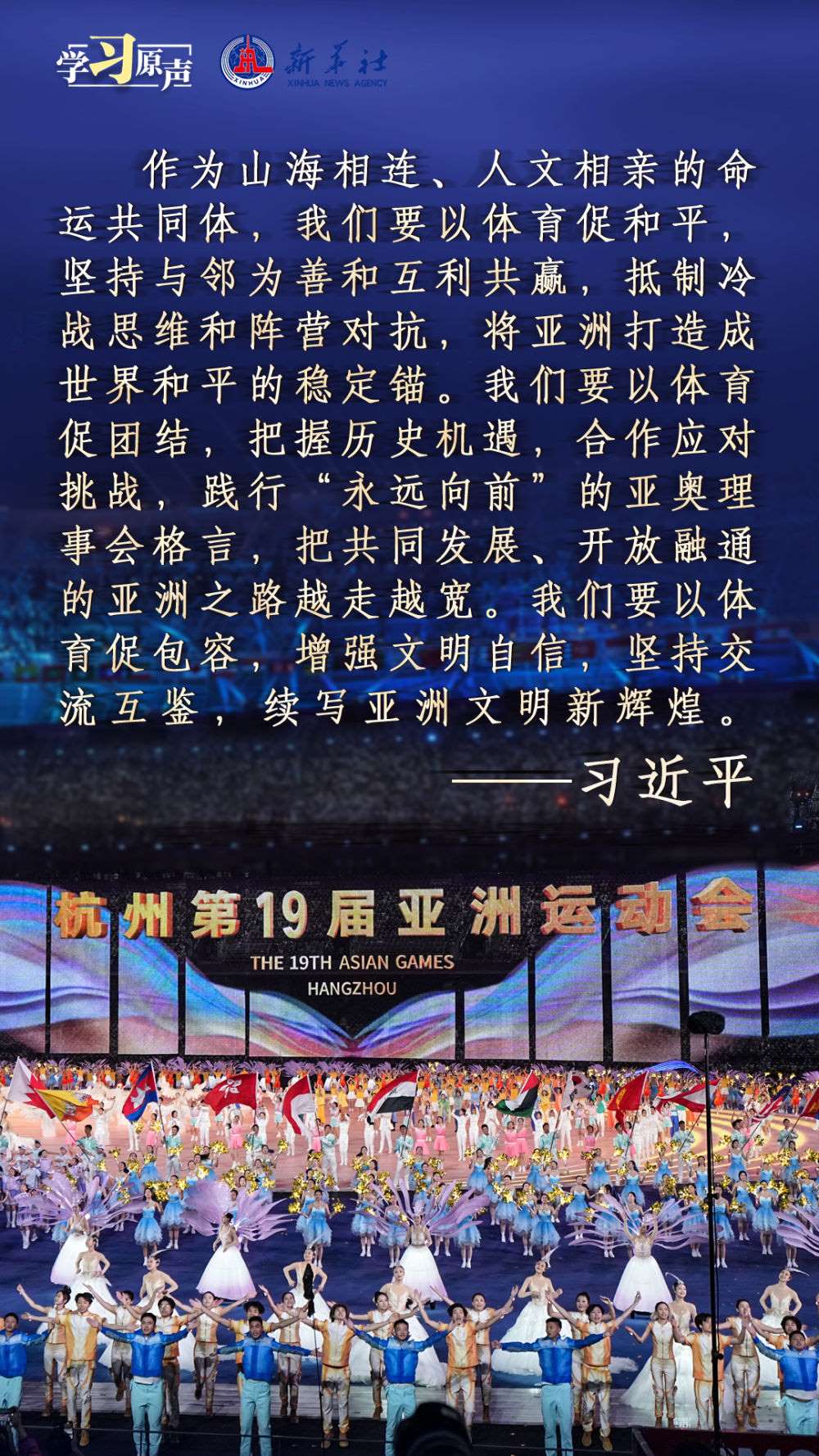 秋分時(shí)節(jié),舉世矚目的杭州第十九屆亞洲運(yùn)動(dòng)會(huì)隆重開(kāi)幕?!皝喼捱\(yùn)動(dòng)會(huì)承載著亞洲人民對(duì)和平、團(tuán)結(jié)、包容的美好向往?!绷?xí)近平主席在杭州第十九屆亞洲運(yùn)動(dòng)會(huì)開(kāi)幕式歡迎宴會(huì)上的致辭,傳遞著熱情友好的情誼,宣示了新時(shí)代中國(guó)推動(dòng)亞洲大家庭團(tuán)結(jié)合作的堅(jiān)定決心,為促進(jìn)亞洲和國(guó)際奧林匹克運(yùn)動(dòng)發(fā)展、共建亞洲命運(yùn)共同體注入強(qiáng)大信心與力量。