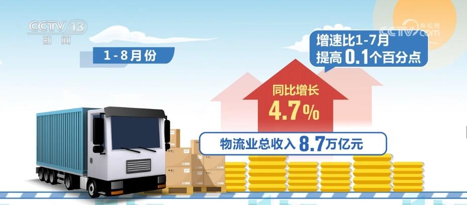 1—8月份,物流業(yè)總收入8.7萬(wàn)億元,同比增長(zhǎng)4.7%,增速比1—7月提高0.1個(gè)百分點(diǎn)。