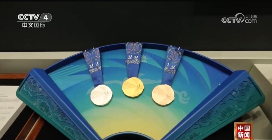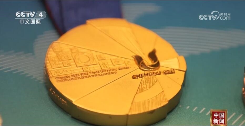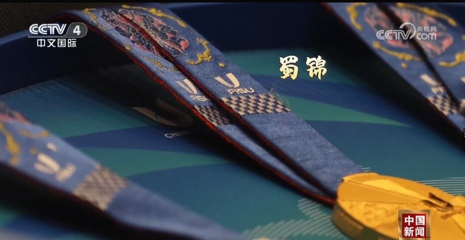 總臺記者 王豐:走進成都大運會博物館,最大的感受就是成都的元素?zé)o處不在。比如,我們剛一進來,右手邊是成都大運會的吉祥物蓉寶??赐耆貙殠鷣砜纯慈毓?,什么是蓉光呢?獎牌代表了成都大運會的榮譽,“蓉”是取自成都的簡稱,包含了光榮和融合的含義,整個獎牌的設(shè)計是呈現(xiàn)了不規(guī)則的圓形。另外,獎牌的元素包含成都市的標(biāo)志——太陽神鳥。此外,在獎牌的綬帶設(shè)計上首次采用了蜀錦的制作工藝,實際上也是非物質(zhì)文化遺產(chǎn)活化利用的非常好的案例。