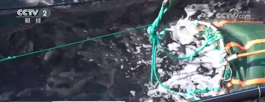 在煙臺長島南隍城海域,隨著經海系列深水網箱里魚類的成熟,一場在大海上的收獲正在進行。起降機將一個個裝滿魚兒的巨大網兜轉移到運輸船上,2.5萬尾近4萬斤的成品黑鲪魚,將從這里銷往全國各地。