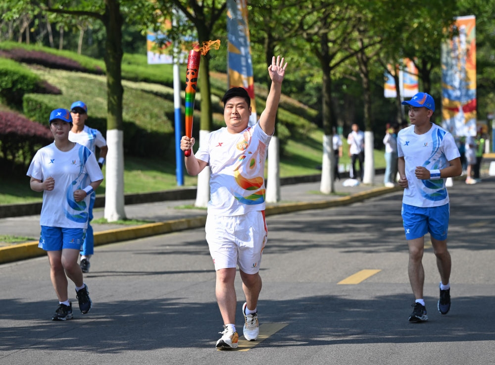 7月8日,火炬手王柯皓在火炬?zhèn)鬟f中。新華社記者胥冰潔攝