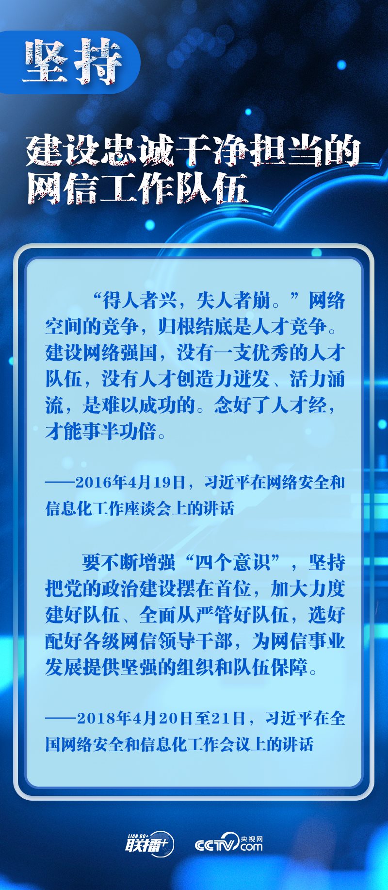 新時代新征程,網(wǎng)信事業(yè)的重要地位作用日益凸顯。央視網(wǎng)《聯(lián)播+》欄目圍繞總書記提出的十個“堅持”,與您一起學(xué)習(xí)總書記關(guān)于網(wǎng)絡(luò)安全和信息化工作的重要思想。