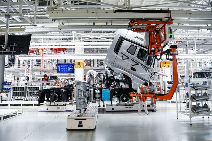 在位于吉林長(zhǎng)春的一汽解放汽車有限公司J7智能工廠內(nèi),工人在AGV(搬運(yùn)機(jī)器人)上裝配車輛(2023年6月12日攝)。新華社記者 顏麟蘊(yùn) 攝
