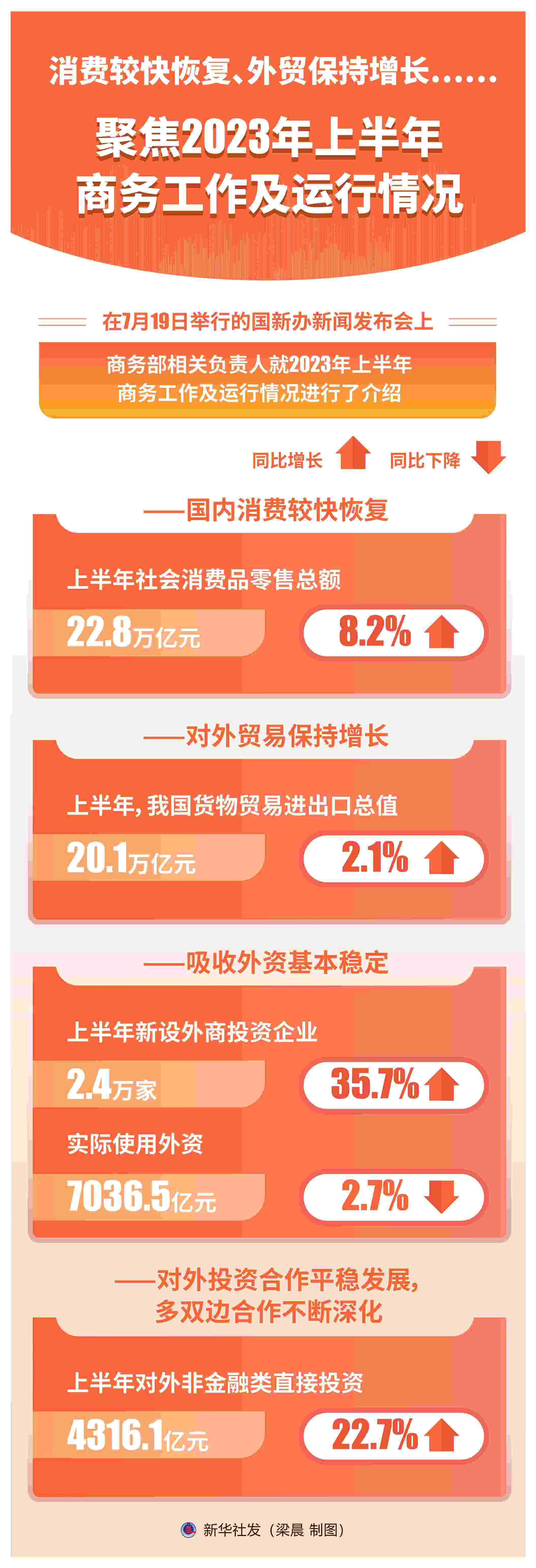 新華社北京7月19日電 題:消費較快恢復、外貿(mào)保持增長……聚焦2023年上半年商務(wù)工作及運行情況