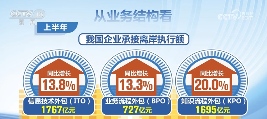 數(shù)據(jù)顯示,2023年上半年,我國企業(yè)承接服務外包合同額10917億元人民幣,執(zhí)行額7400億元,同比分別增長10.6%和14.7%。從業(yè)務結構看,上半年,我國企業(yè)承接離岸信息技術外包(ITO)、業(yè)務流程外包(BPO)和知識流程外包(KPO)執(zhí)行額分別為1767億元、727億元和1695億元,同比分別增長13.8%、13.3%和20.0%。其中,信息技術解決方案服務、管理咨詢服務、互聯(lián)網營銷推廣服務等離岸服務外包業(yè)務增速較快。