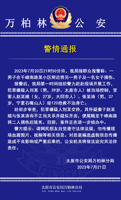 ·太原一男子懷疑妻子與他人有不正當關(guān)系,將二人捅傷致死,已被警方當場控制。