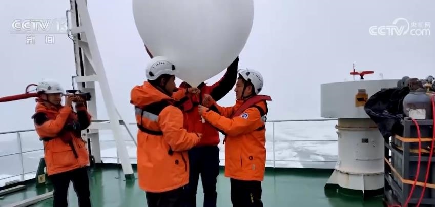 在“雪龍2”號(hào)的9層甲板,大氣環(huán)境組的科考隊(duì)員們正在為氣象探空氣球充氣,這個(gè)氣球?qū)y帶無線電探空儀,飛到兩三萬米的高空,探測大氣自下而上的溫度、濕度、氣壓、風(fēng)向、風(fēng)速等數(shù)據(jù)。