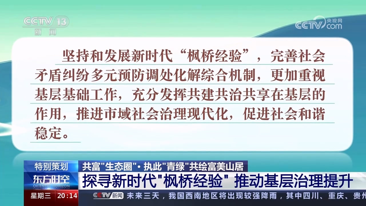 作為“楓橋經(jīng)驗(yàn)”發(fā)源地,浙江也一直在探尋“楓橋經(jīng)驗(yàn)”的新內(nèi)涵。習(xí)近平總書(shū)記強(qiáng)調(diào),堅(jiān)持和發(fā)展新時(shí)代“楓橋經(jīng)驗(yàn)”,完善社會(huì)矛盾糾紛多元預(yù)防調(diào)處化解綜合機(jī)制,更加重視基層基礎(chǔ)工作,充分發(fā)揮共建共治共享在基層的作用,推進(jìn)市域社會(huì)治理現(xiàn)代化,促進(jìn)社會(huì)和諧穩(wěn)定。