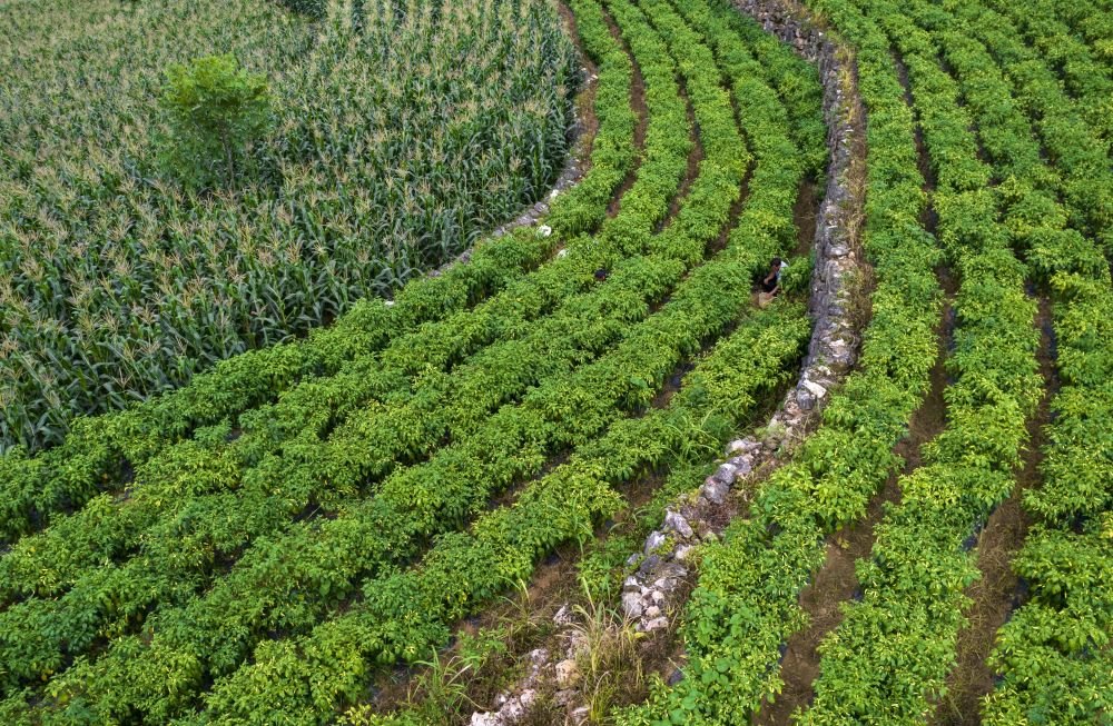7月27日,一位村民在木者村“摸石谷”中建成的“三?!迸_地上干農(nóng)活。新華社記者 楊植森 攝