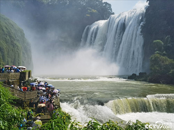 8月11日,貴州安順,游客在黃果樹瀑布景區(qū)游覽。暑期以來,黃果樹風景區(qū)瀑布水勢磅礴、飛瀉而下,進入最佳觀賞季。
