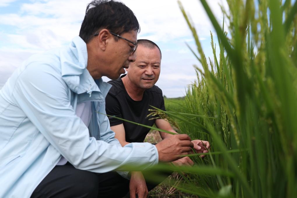 8月11日,黑龍江省尚志市農(nóng)業(yè)技術(shù)推廣中心的工作人員在當(dāng)?shù)匾惶幈缓樗葸^(guò)的水稻田里查看水稻情況。新華社記者張濤 攝