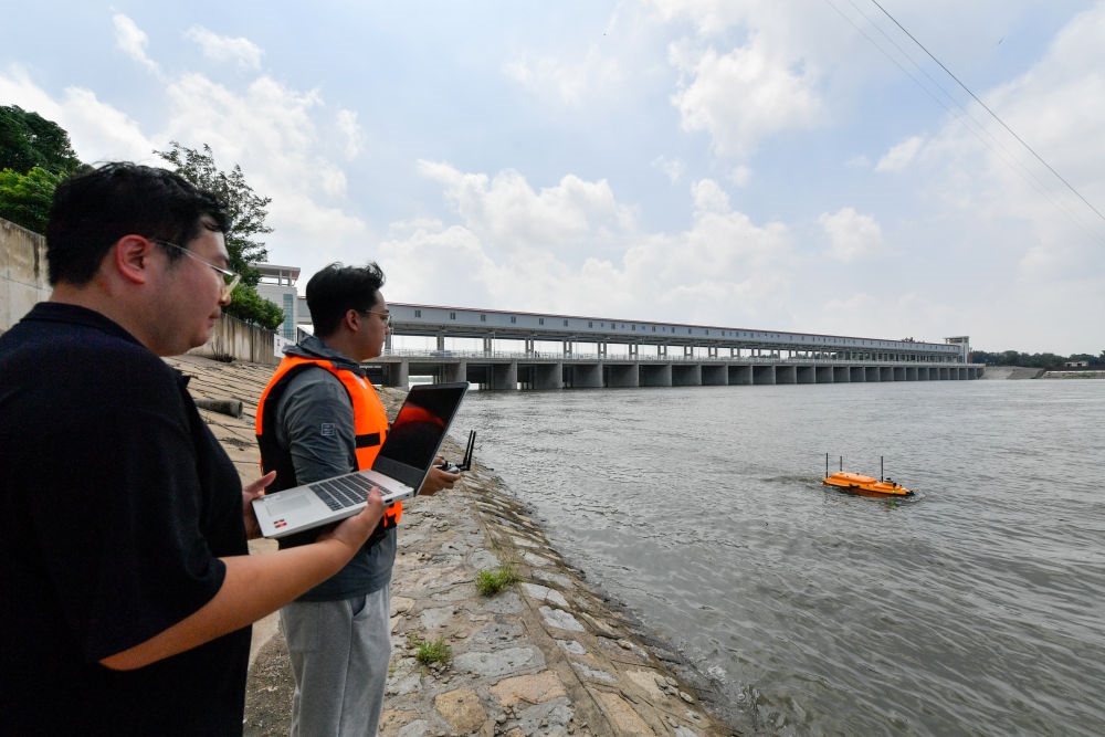 8月2日,在天津市獨(dú)流減河進(jìn)洪閘上游,水文人員操作無人水文監(jiān)測(cè)船進(jìn)行水文監(jiān)測(cè)。新華每日電訊記者孫凡越攝