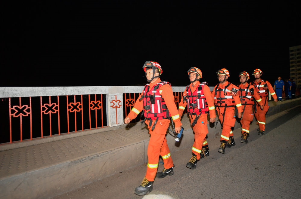 8月9日凌晨,在天津市靜海區(qū)臺(tái)頭鎮(zhèn),天津消防救援總隊(duì)的消防員巡查經(jīng)過革命橋。新華每日電訊記者孫凡越攝