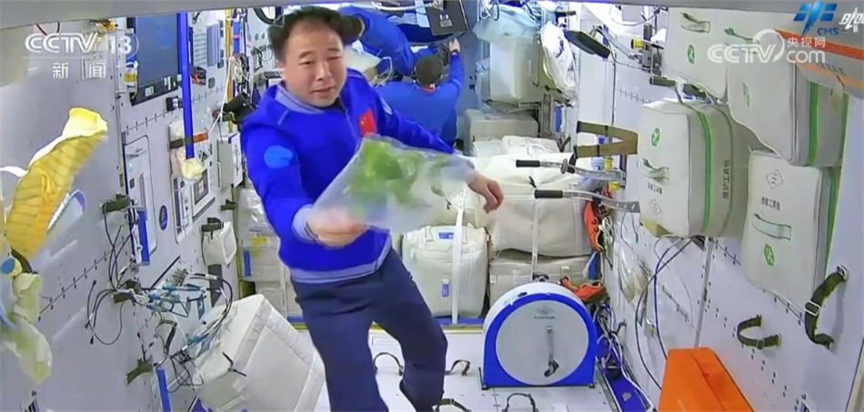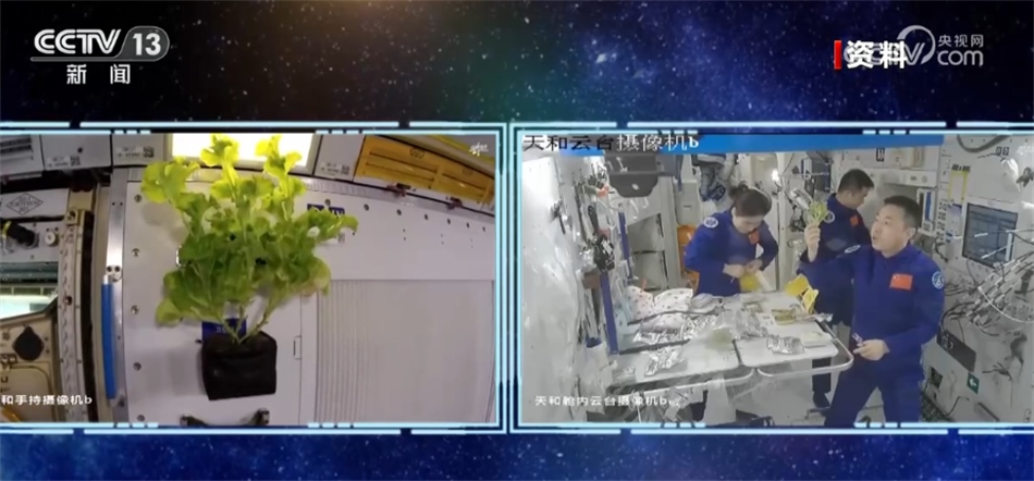 這就是被稱為“太空菜園”的太空栽培裝置,該裝置是中國(guó)航天員科研訓(xùn)練中心科研人員設(shè)計(jì)的一種模塊化的簡(jiǎn)易太空植物栽培裝置,采用開(kāi)放式結(jié)構(gòu),航天員可以與植物隨時(shí)親密接觸。植物生長(zhǎng)所需要的二氧化碳、溫濕度和氧氣等氣體環(huán)境和艙內(nèi)航天員基本一致,植物種植操作簡(jiǎn)單,便于照料。航天員還可按個(gè)人喜好將該裝置任意擺放在艙內(nèi)有光照的地方,為自己的工作生活環(huán)境增添一抹綠意。這次種植的生菜得到科學(xué)配置的光照和水分,在太空環(huán)境下也長(zhǎng)勢(shì)喜人。