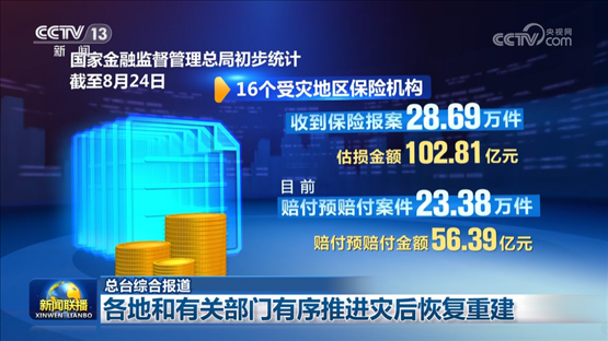 國家金融監(jiān)督管理總局初步統(tǒng)計,截至8月24日,16個受災地區(qū)保險機構收到保險報案28.69萬件,估損金額102.81億元。目前賠付預賠付案件23.38萬件,賠付預賠付金額56.39億元。