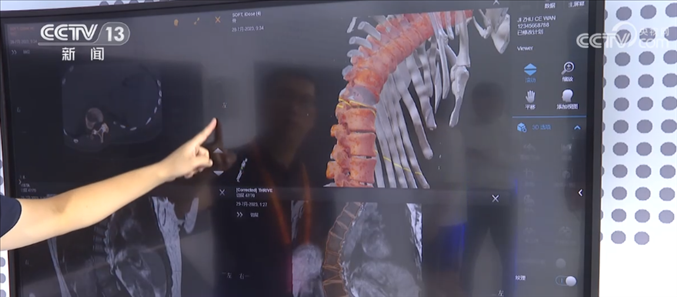 總臺記者 王豐:這里主要呈現(xiàn)的是一個智能手術(shù)室的系統(tǒng),這是一套幫助醫(yī)生進行精準手術(shù)計劃的設備,比如說我們可以利用一張X光片,一張CT或者一張核磁影像,就可以還原出一個3D的影像,醫(yī)生通過3D的建模,可以精準地看到病灶所在的位置,包括他如何下刀,來精準地制定手術(shù)計劃。