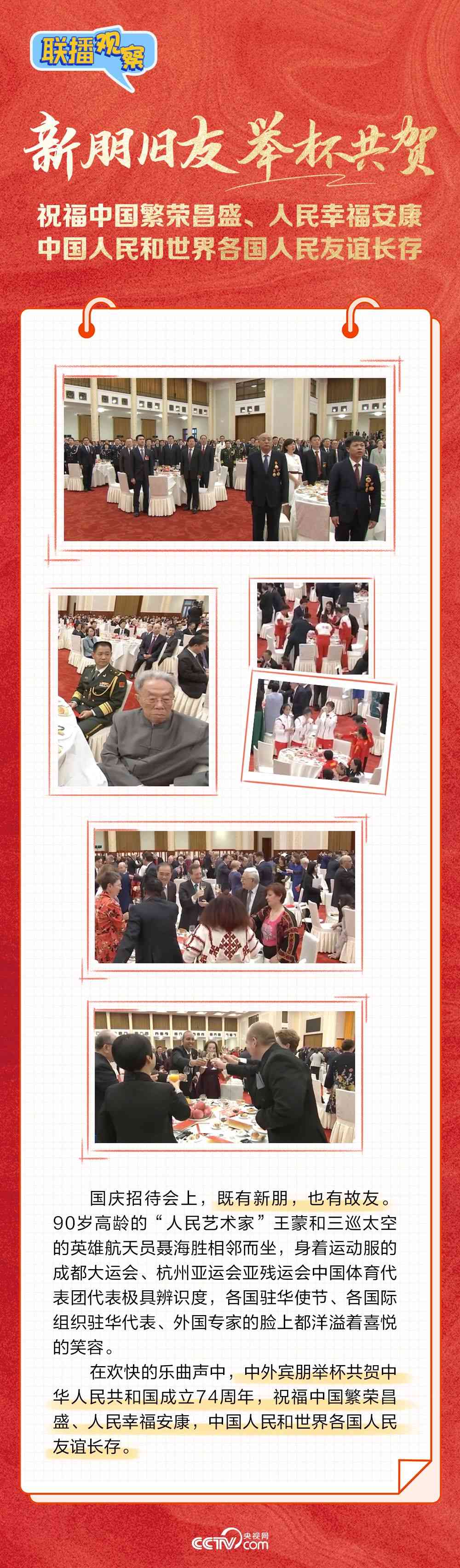 在歡快的樂曲聲中,中外賓朋舉杯共賀中華人民共和國成立74周年。作為一場(chǎng)“簡(jiǎn)約而不簡(jiǎn)單”的高規(guī)格國宴,習(xí)近平總書記在講話中強(qiáng)調(diào)了哪些重點(diǎn)內(nèi)容?國慶招待會(huì)的餐桌有哪些亮點(diǎn)細(xì)節(jié)?都有哪些新朋舊友出現(xiàn)在招待會(huì)上?央視網(wǎng)《聯(lián)播觀察》與您一同“云參會(huì)”。