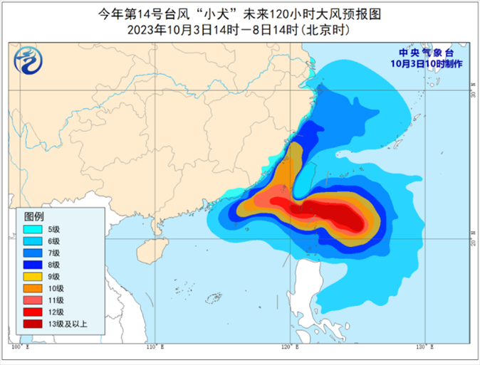 大風(fēng)預(yù)報(bào):3日下午至8日,臺灣以東洋面、巴士海峽、東海大部、臺灣海峽、南海東北部以及杭州灣、浙江沿海、福建沿海、廣東東南部沿海以及臺灣島沿海將有6~8級大風(fēng),其中,臺灣以東洋面、巴士海峽、臺灣海峽、南海東北部部分海面、福建沿海、廣東東南部沿海、臺灣島東南部和西部沿海的風(fēng)力將有9~12級,“小犬”中心經(jīng)過的附近海面風(fēng)力可達(dá)13~16級,陣風(fēng)17級。