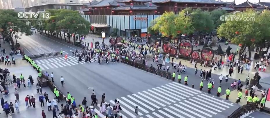 通過對系統(tǒng)獲取的大數(shù)據(jù)進(jìn)行分析研判,大唐不夜城從假期第一天的下午就啟動(dòng)了管控預(yù)案,對游客進(jìn)行單向循環(huán)引導(dǎo),防止人流擁堵和對沖。同時(shí),在步行街上,身著各種制服的工作人員很早就開始了安全檢查等工作,排查存在的隱患。