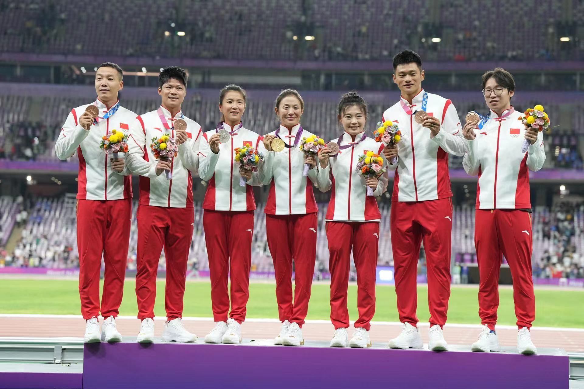 10月4日晚,在杭州亞運會田徑比賽全部結(jié)束后,中國奧委會為蘇炳添、謝震業(yè)、吳智強(qiáng)、湯星強(qiáng)、切陽什姐、劉虹和呂秀芝補(bǔ)發(fā)了奧運會獎牌。