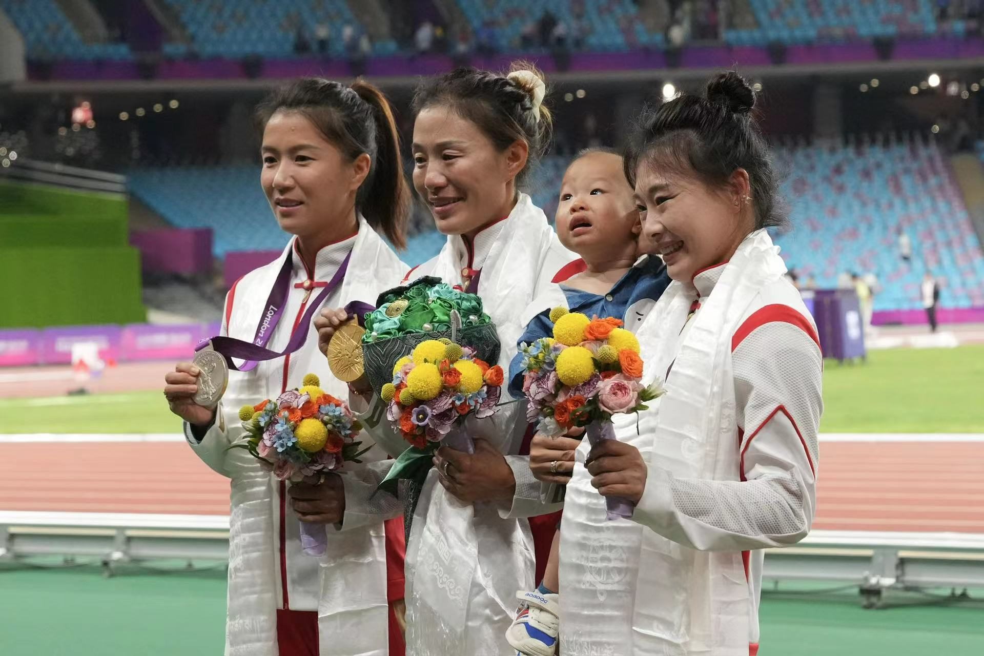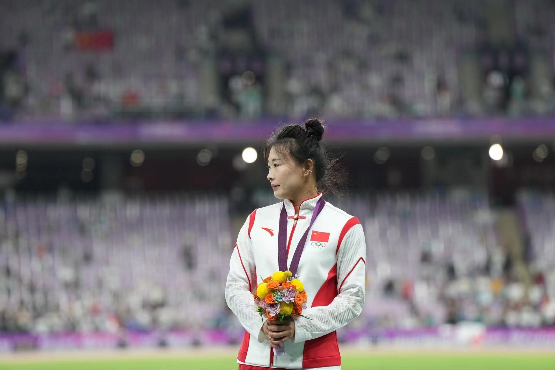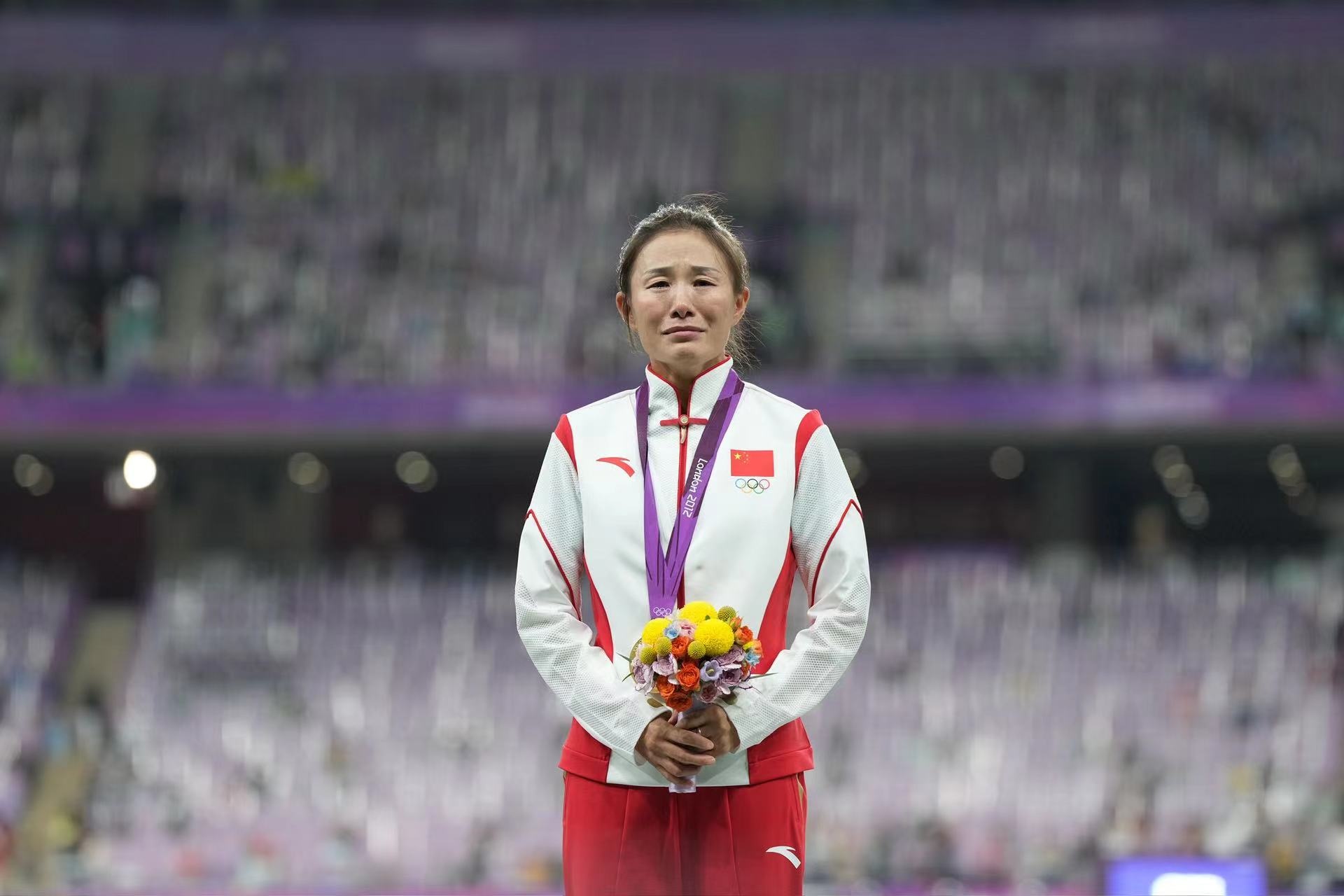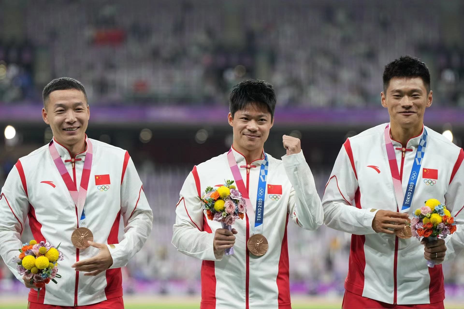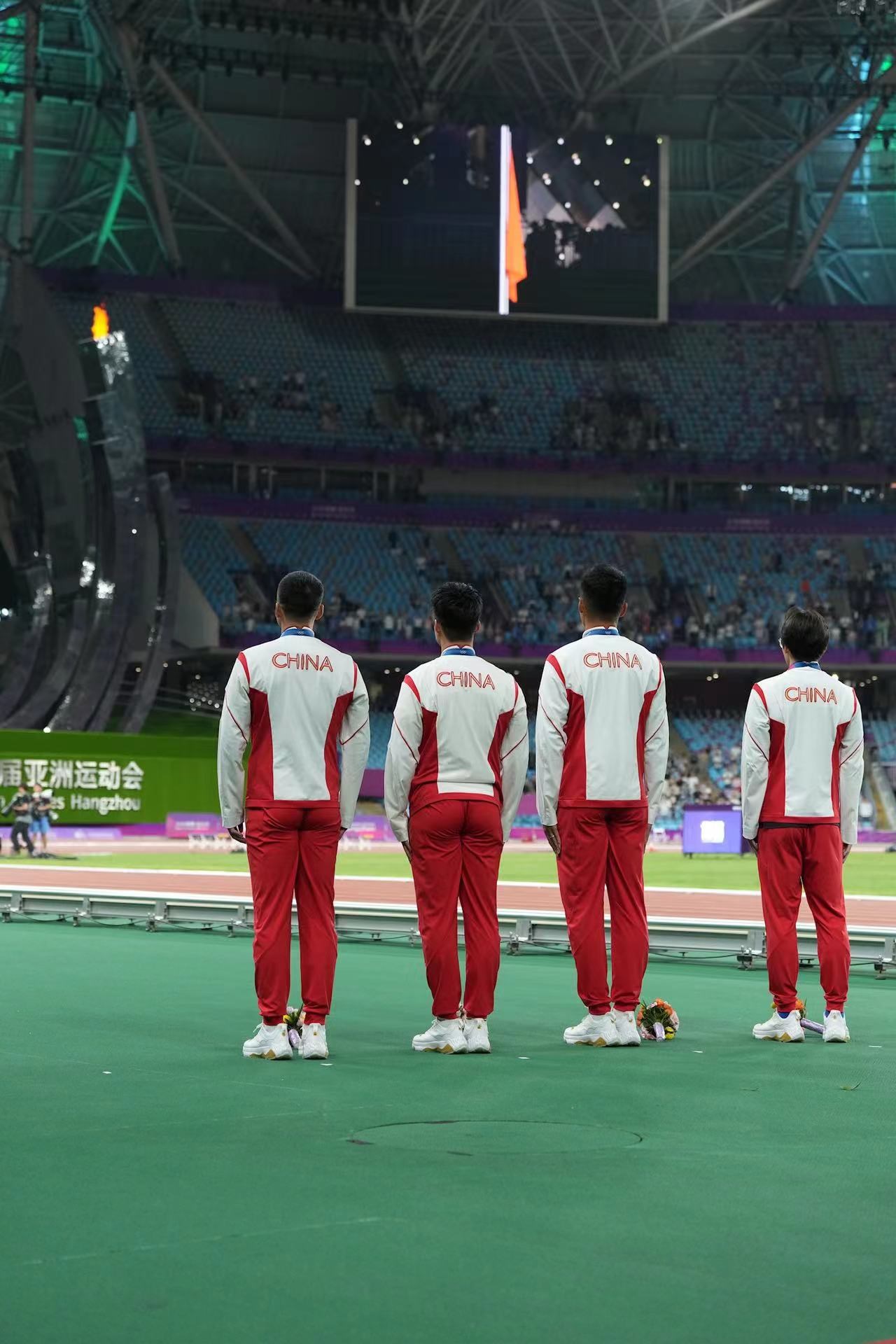 補(bǔ)發(fā)現(xiàn)場,首先頒發(fā)的是男子4×100米接力銅牌。四位中國小伙子笑著走上銅牌領(lǐng)獎臺,接受頒獎。隨后的競走頒獎儀式上,在三位得獎運動員獲頒獎牌后,《義勇軍進(jìn)行曲》奏響,三面五星紅旗冉冉升起,切陽什姐眼中涌動著晶瑩的淚花。
