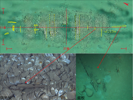 沉船遺址水深約30米,主體區(qū)域殘存有木質(zhì)船體和成摞擺放的船貨堆積,范圍約300平方米。考古發(fā)掘發(fā)現(xiàn),沉船船體殘長約16.95米,最寬處保存約4.5米,殘存9道隔艙板和10個(gè)船艙,單層板結(jié)構(gòu),發(fā)現(xiàn)桅座、龍骨板、龍骨補(bǔ)強(qiáng)材以及舭龍骨等船體構(gòu)件。