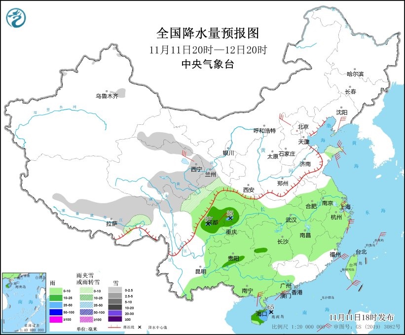 11月11日20時(shí)至12日20時(shí),新疆沿天山地區(qū)、西藏中部和東部、青海北部和東南部、甘肅中南部和河西、山東半島、川西高原北部等地部分地區(qū)有小雪或雨夾雪。四川盆地、貴州南部、湖南西南部、海南島等地部分地區(qū)有中到大雨,局地有暴雨(50~65毫米)。遼東半島、青海北部、河北北部、山東半島、四川盆地中部、浙江東部等地部分地區(qū)有5~6級(jí)風(fēng)。東海南部、臺(tái)灣海峽、臺(tái)灣以東洋面、巴士海峽、南海北部和中部、北部灣有7~8級(jí)、陣風(fēng)9級(jí)的大風(fēng)(見圖4)。