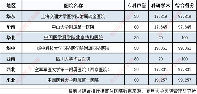 分地區(qū)看,中國醫(yī)學(xué)科學(xué)院北京協(xié)和醫(yī)院和四川大學(xué)華西醫(yī)院分別以??坡曌u(yù)(80)、科研學(xué)術(shù)(20)雙滿分的成績領(lǐng)跑華北地區(qū)、西南地區(qū)的綜合排行榜,中國醫(yī)科大學(xué)附屬第一醫(yī)院和華中科技大學(xué)同濟(jì)醫(yī)學(xué)院附屬同濟(jì)醫(yī)院則分別以99.257和99.061的成績領(lǐng)跑東北地區(qū)和華中地區(qū)。此外,上海交通大學(xué)醫(yī)學(xué)院附屬瑞金醫(yī)院、中山大學(xué)附屬第一醫(yī)院、空軍軍醫(yī)大學(xué)第一附屬醫(yī)院(西京醫(yī)院)也分別在各地區(qū)的綜合排行榜中位列首位。