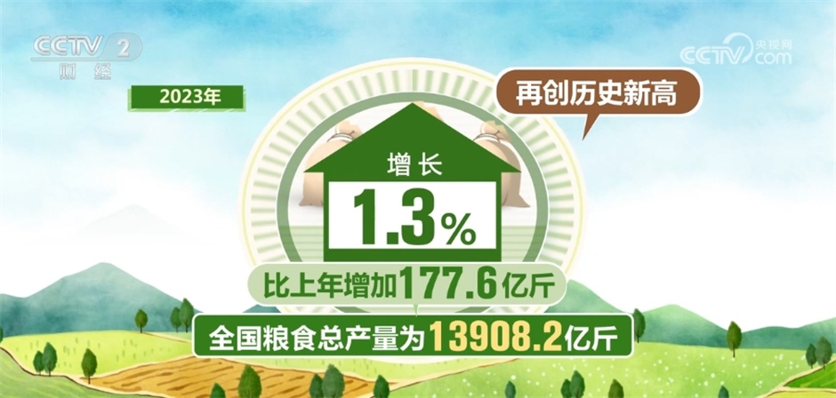國家統(tǒng)計局今天(12月11日)發(fā)布的數據顯示,2023年,全國糧食總產量為13908.2億斤,比上年增長1.3%,全年糧食產量再創(chuàng)歷史新高。