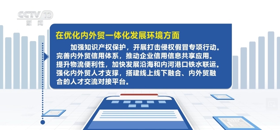 在優(yōu)化內(nèi)外貿(mào)一體化發(fā)展環(huán)境方面,加強(qiáng)知識產(chǎn)權(quán)保護(hù),開展打擊侵權(quán)假冒專項行動。完善內(nèi)外貿(mào)信用體系,推動企業(yè)信用信息共享應(yīng)用。提升物流便利性,加快發(fā)展沿海和內(nèi)河港口鐵水聯(lián)運(yùn)。強(qiáng)化內(nèi)外貿(mào)人才支撐,搭建線上線下融合、內(nèi)外貿(mào)融合的人才交流對接平臺。